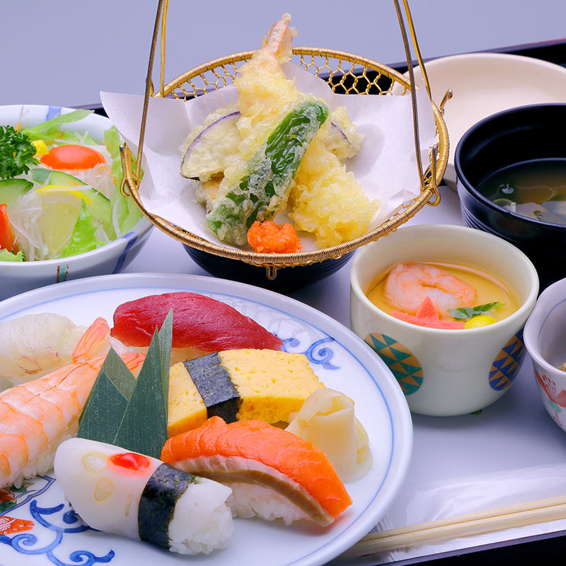 天ぷらや茶わん蒸しなどお寿司とセットのお得なメニューです。