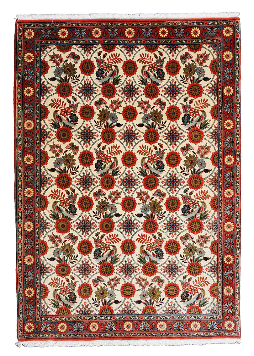 イランにある大きい村で作られている絨毯。ミナ・ハニと呼ばれる花文様が特徴で、蝶や鳥もいて華やかなデザイン。20年から40年くらい前に作られたオールド絨毯です。