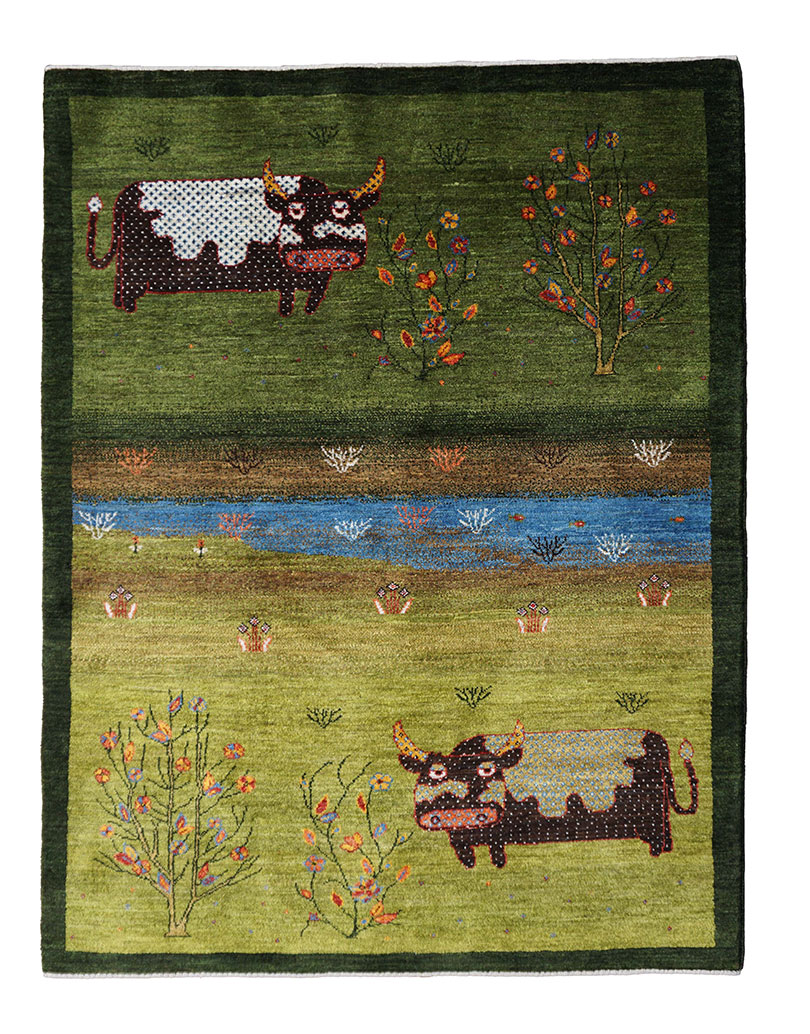 イランの遊牧民が手織りで作った毛足の長い厚みのある絨毯。質の良いウールで絵画のようなデザインです。ギャッベでは珍しい牛柄で、牛は繁栄や豊かさをあらわす縁起の良い柄です。