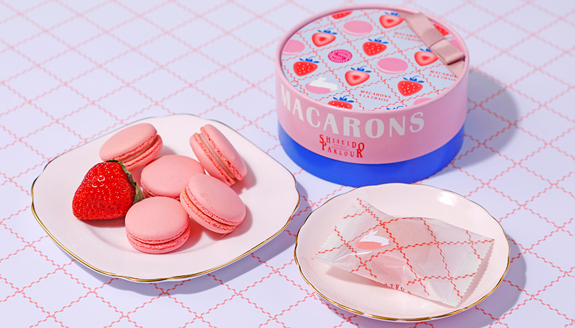 メレンゲに砂糖、アーモンドプードル、福岡県産あまおう苺のピューレを加えた生地を焼き上げ、あまおう苺ピューレとバニラビーンズ入りのバニラペーストを合わせたクリームをサンドしました。