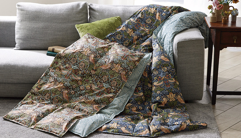 モリスの独創的なデザイン”いちご泥棒”。お昼寝、ひざ掛けとオールシーズン使い勝手のよいサイズのハーフケットです。