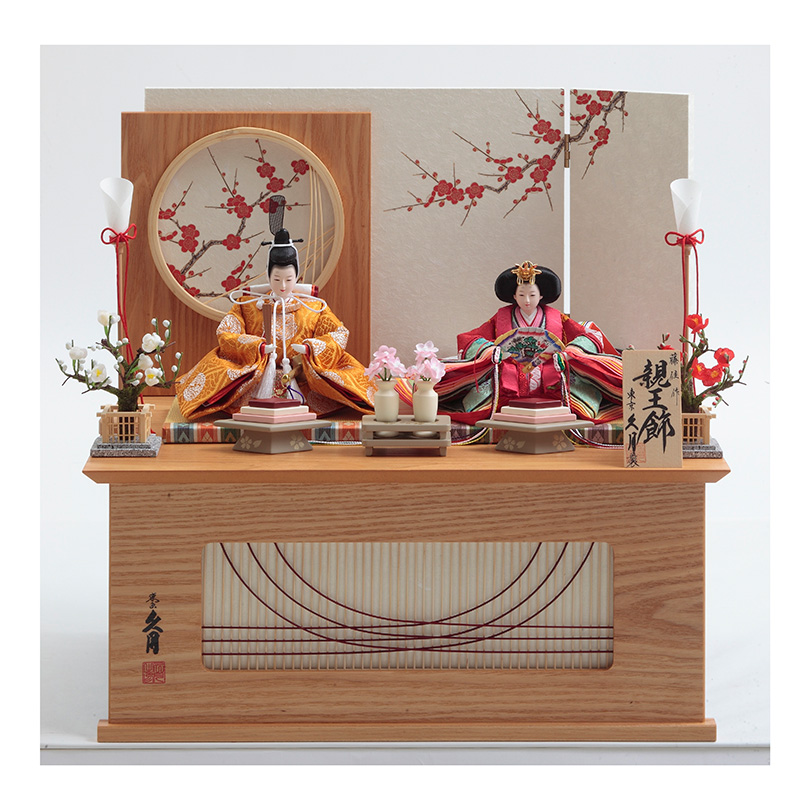 紅梅と千筋細工の施された収納箱と屏風。色彩豊かな衣裳のお雛様。女流作家の感性が光る一品です。