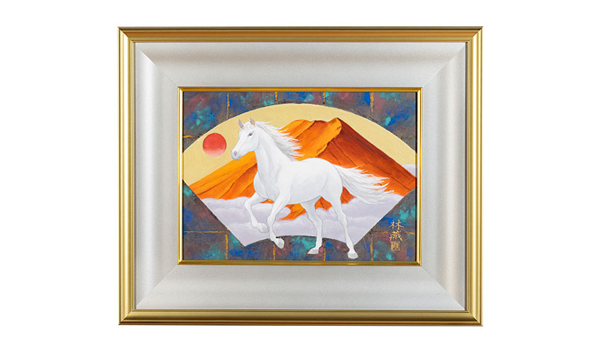 「馬」を描きたいが、どの様に描くのか。目をつむり自分に問いかけた時、初陽(はつひ)に染まる赤富士を背に、白馬が颯爽と駆けてゆく景色が 浮かんできました。扇面と箔を使い、「和」の表現も加えました。