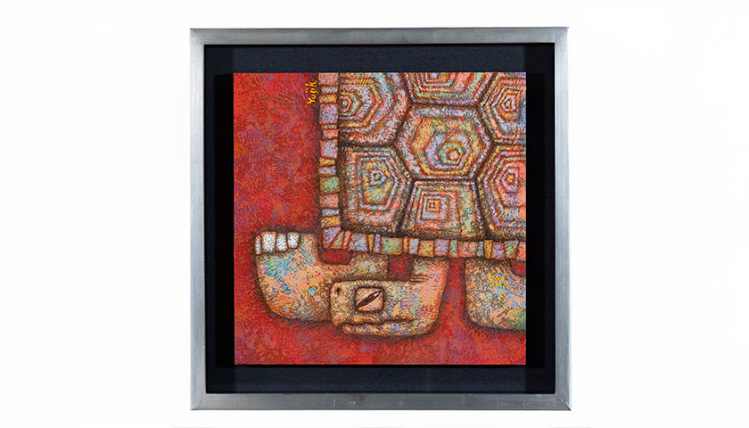 今回の新作カメは、昔から存在する長寿の象徴です。意図的なひび割れなどが混在するユニークなマチエール、重層的に塗り重ねられた鮮烈かつ柔らかな色彩美は独自の境地を拓きます。