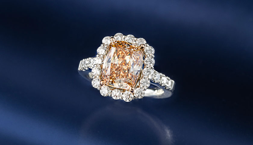 上品な輝きが魅力のクッションカットをセンターストーンに、廻りには虹色に輝くラウンドブリリアンカットのダイヤモンドがデザインされています。センターストーンは大粒4カラットアップのダイヤモンド。